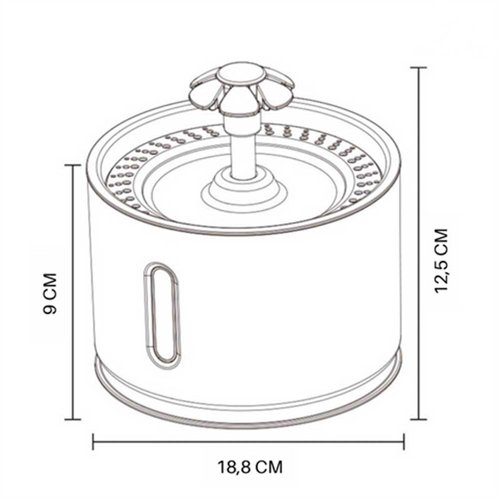 O sistema inteligente mantém a água sempre fresca. A bomba silenciosa funciona por USB, e o refil com flor cascata mantém a limpeza com muito estilo!