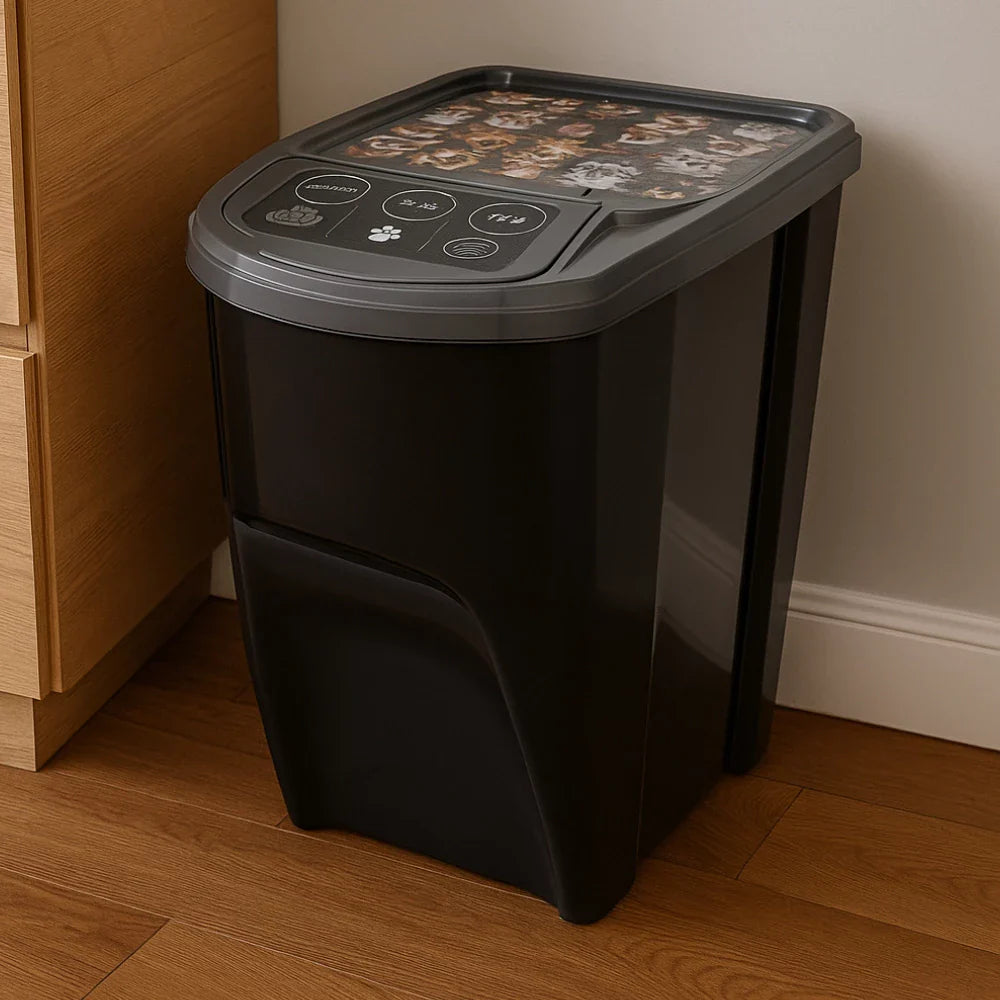 Com capacidade para até 17kg de ração, ele permite guardar todo o saco de uma só vez, protegendo os grãos contra umidade, sujeira e insetos — tudo isso otimizando espaço na sua casa.