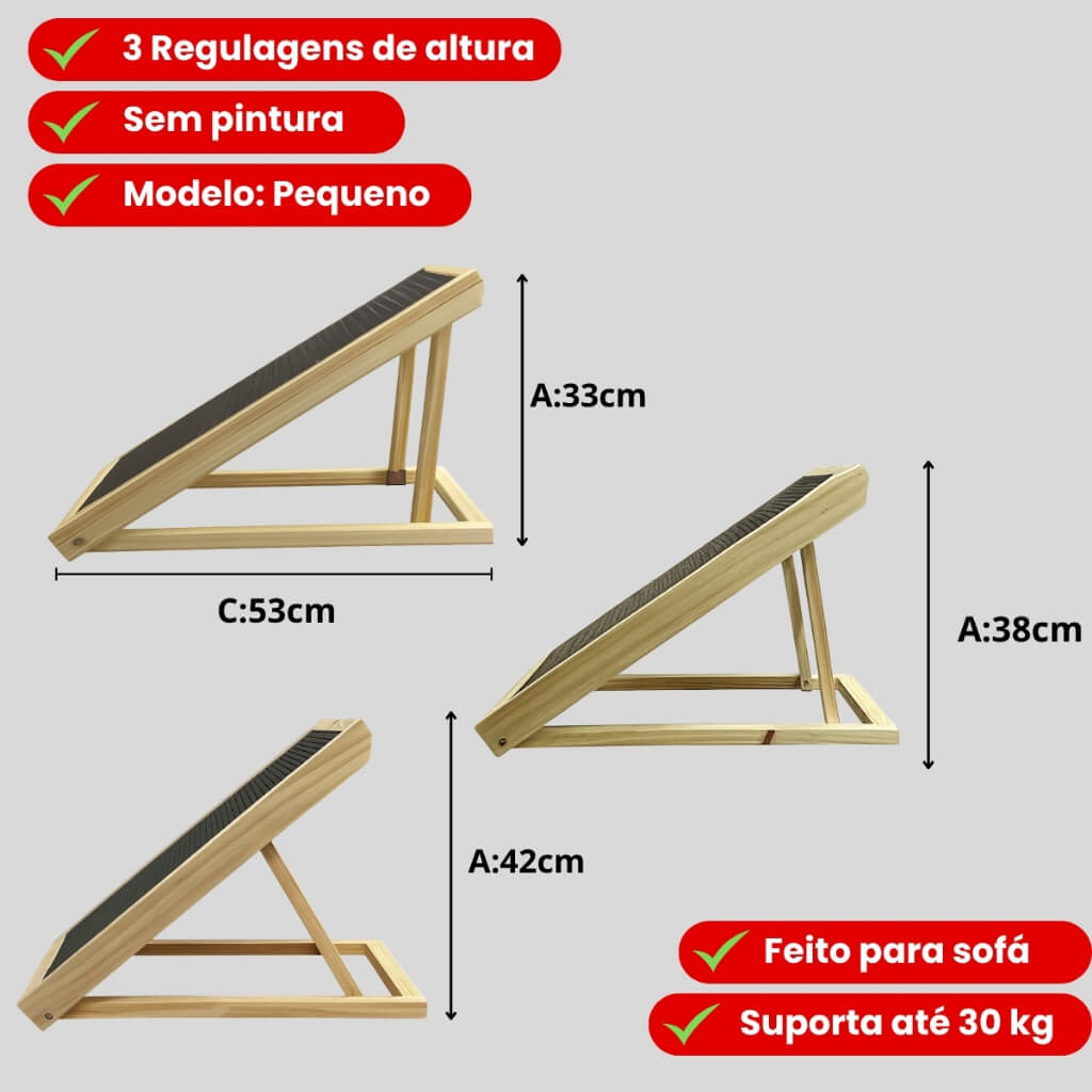 Fabricada em madeira de pinus de alta qualidade com acabamento em verniz cerejeira, a rampa combina resistência, design sofisticado e durabilidade. A superfície emborrachada antiderrapante evita escorregões e protege seu pet durante toda a subida e descida.